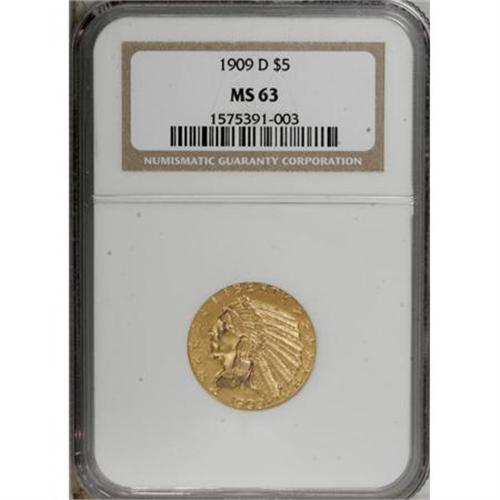 <B>1909-D $5 MS63 NGC.</B></I> Both sides of this Select half eagle are awash in luster, and yellow-gold surfaces exhibit sharply defined motifs, though minor softness is noted on the eagle's shoulder. Light contact marks, especially in the raised, exposed fields, preclude a higher grade. The 1909-D is a common date of the series, and available in most Mint State grades (Jeff Garrett and Ron Guth, 2006).<BR><BR><b>Shipping:</b> Coins & Currency (<a target="_blank" href="http://www.heritageauctions.com/common/shipping.php">view shipping information</a>)