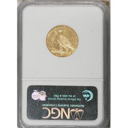 <B>1909-D $5 MS63 NGC.</B></I> Bright luster adorns both sides of this '09-D five dollar, and a well executed strike brings out sharp definition on the design elements, including excellent detail on the Indian's bonnet feathers, and on the eagle's plumage. Peach-gold surfaces reveal a scattering of grade-defining marks..<BR><BR><b>Shipping:</b> Coins & Currency (<a target="_blank" href="http://www.heritageauctions.com/common/shipping.php">view shipping information</a>)