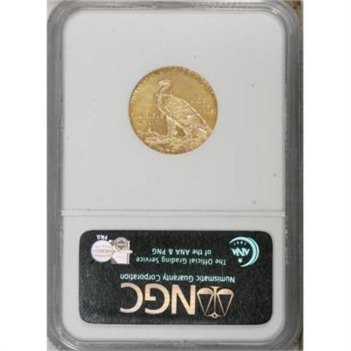 <B>1909-D $5 MS63 NGC.</B></I> Even honey-gold toning is illuminated by intense mint frost on the reverse, while the obverse has a more satiny appearance. Boldly struck with a sharply defined mintmark, and a few stray field abrasions that limit the grade. A pleasing Select Mint State specimen. <BR><BR><B>Coin Engraver:</B> Bela Lyon Pratt<BR><BR><b>Shipping:</b> Coins & Currency (<a target="_blank" href="http://www.heritageauctions.com/common/shipping.php">view shipping information</a>)