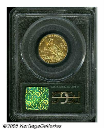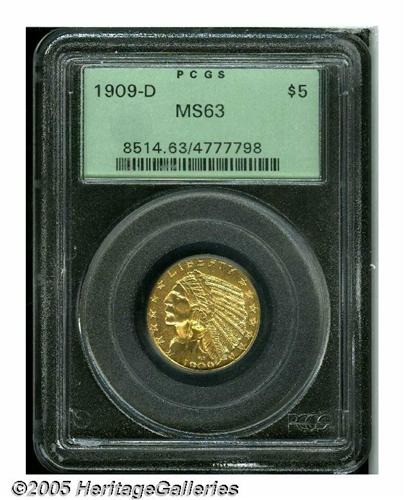 <B>1909-D<$5> MS63 PCGS.</B></I> A bright and sharply struck honey-gold type coin with lovely eye appeal for the Select level. Distributed minor field marks are of no relevance. Certified in a prior generation holder.