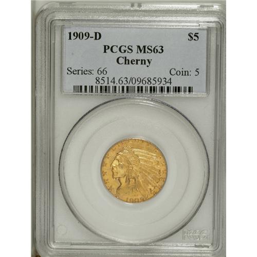 <B>1909-D $5 MS63 PCGS.</B></I> An orange-red type representative with unblemished fields and a quality strike. A minor depression is noted on the cheekbone. A small strike-through on the base of the headdress adds further interest.<BR><I>From The Dr. Eugene Cherny Collection of $5 and $10 Indians.</B></I><BR><BR><b>Shipping:</b> Coin/Currency (<a target="_blank" href="http://www.heritageauctions.com/common/shipping.php">view shipping information</a>)