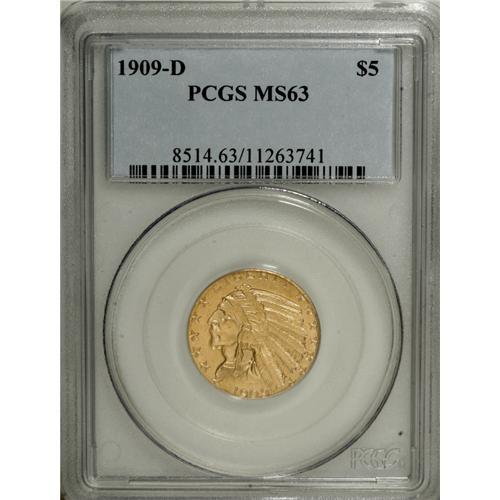 <B>1909-D $5 MS63 PCGS.</B></I> Jeff Garrett and Ron Guth (2006) call the 1909-D, with a mintage of 3,423,560 pieces, the most common date of the Indian Head five dollar series. Excellent design detail is apparent on this Select example, and the surfaces yield pleasing luster. A scattering of light handling marks over each side accounts for the grade.<BR><BR><b>Shipping:</b> Coins & Currency (<a target="_blank" href="http://www.heritageauctions.com/common/shipping.php">view shipping information</a>)