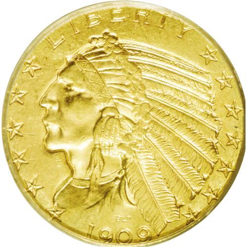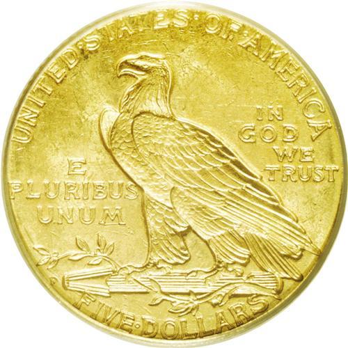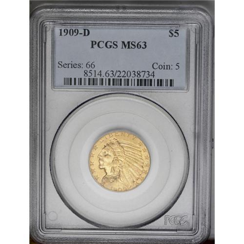 <B>1909-D<$5> MS63 PCGS.</B></I> Mild reddish-golden color rises from highly lustrous surfaces, on which a well-detailed strike appears. A few marks can be discerned, but are not obtrusive.