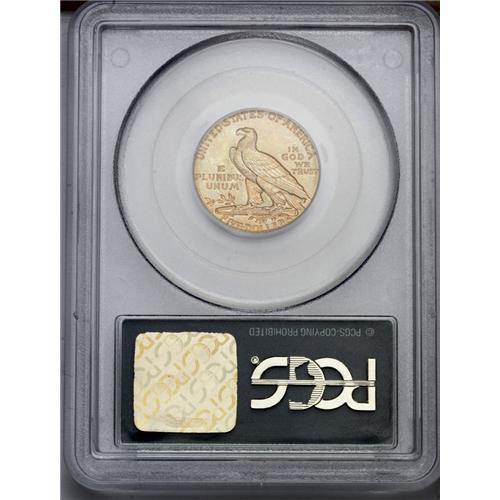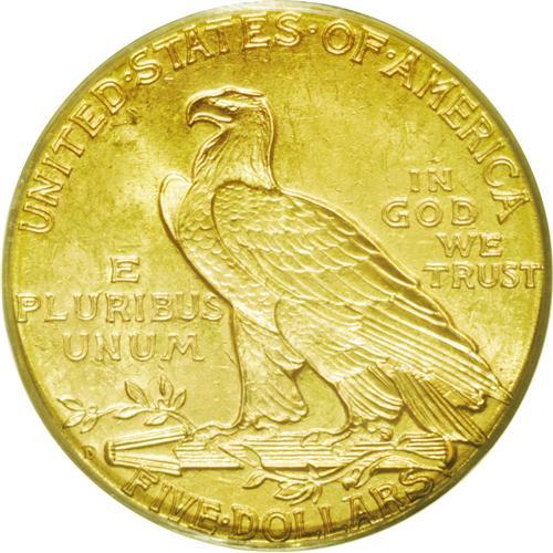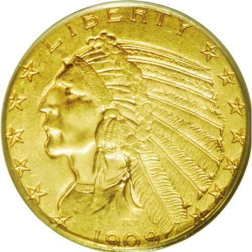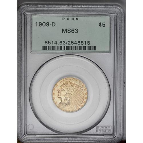 <B>1909-D<$5> MS63 PCGS.</B></I> Original peach and olive toning alternates across this gently shimmering and boldly impressed Indian gold type coin. Delicate marks are distributed in the fields, but no abrasions are individually consequential. Encapsulated in a green label holder.