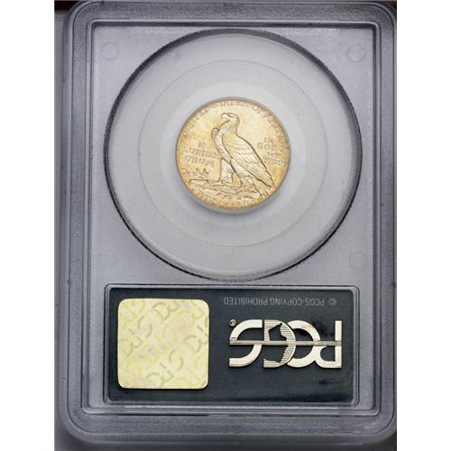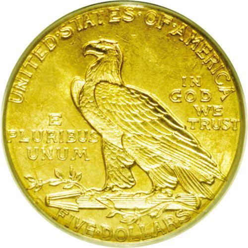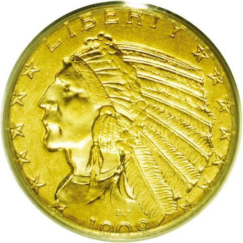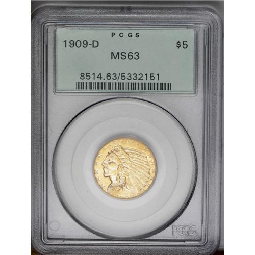 <B>1909-D<$5> MS63 PCGS.</B></I> Rich lemon toning dominates the fields and highpoints of this boldly impressed and attractive gold type coin. The obverse is refreshingly clean, and the reverse field has a few minor marks. A dropped letter mint error; a small D is seen beneath the first S in STATES. This occurs when debris fills the mintmark area of the reverse die (the lowest relief of the design), then falls out and is struck into the next coin. Encapsulated in a green label holder.