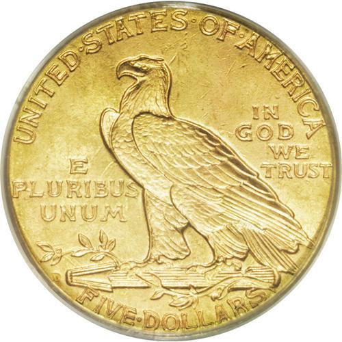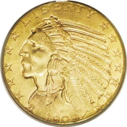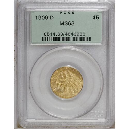 <B>1909-D<$5> MS63 PCGS.</B></I> The luminous surfaces of this Select piece are light greenish-gold. The grade is defined by a few small scrapes on the cheek and jawline and some light reverse abrasions. Despite these minor surface indignities, this is a lovely coin overall, certified in a green-label holder.