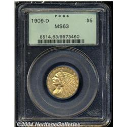 <B>1909-D<$5> MS63 PCGS.</B></I> Encased in an older green-label holder, this typically struck piece displays pleasing color and luster, and a few small, scattered contact marks.<BR><I>From The Greenwich Collection, Part One.</B></I> <BR><BR><B>Important notice:</B> Heritage usually auctions material at the rate of 200-250 lots per hour. On some occasions eBay Live bid software or the Internet may not be able to keep up with the pace of the auction. We recommend placing a realistic absentee bid now as insurance to avoid disappointment. Occasionally the auctioneer may eliminate or reject an eBay Live bid, and the auctioneer may also reopen a lot after the close of the eBay live bidding (usually because we missed an audience bid), and may reject your bid even if it shows you as the winning bidder. By bidding via eBay Live, you agree that Heritage may award the lot to another bidder at its sole discretion under the circumstances described above or any other reasonable circumstances. Since eBay bids are not shown to us until we open the lot on the floor, we treat those bids just like floor bids. In most cases the floor responds before the eBay bid is presented to us, due to Internet lag time, so for consistency we have made it a policy that floor bids are always considered first over tie eBay live bids. Also please note that all Heritage lots purchased through eBay Live carry a 20% Buyer's Premium. Please make sure you read the Terms and Conditions before you bid.