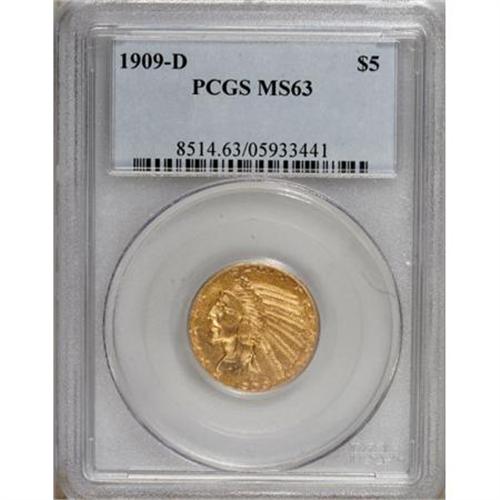 <B>1909-D $5 MS63 PCGS.</B></I> Glimpses of olive patina embrace selected areas of this shimmering and lightly abraded Select gold type coin. Precisely struck throughout, with the mintmark particularly distinct.<BR><BR><b>Shipping:</b> Coins & Currency (<a target="_blank" href="http://www.heritageauctions.com/common/shipping.php">view shipping information</a>)