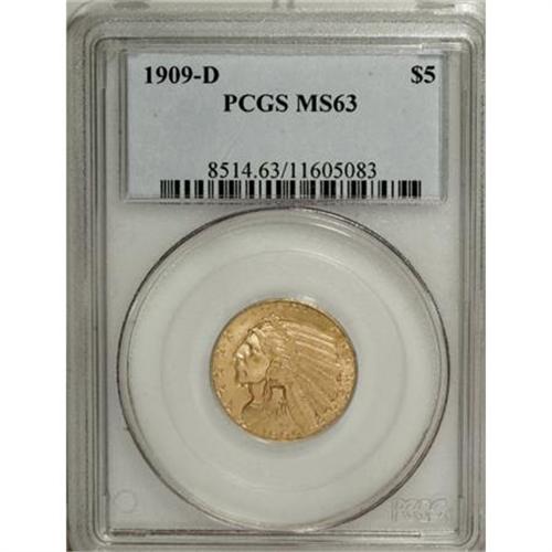 <B>1909-D $5 MS63 PCGS.</B></I> This satiny gold type coin has refreshingly smooth surfaces, and the strike is pleasing, particularly on the mintmark, the branch, and the headdress.<BR><BR><b>Shipping:</b> Coins & Currency (<a target="_blank" href="http://www.heritageauctions.com/common/shipping.php">view shipping information</a>)