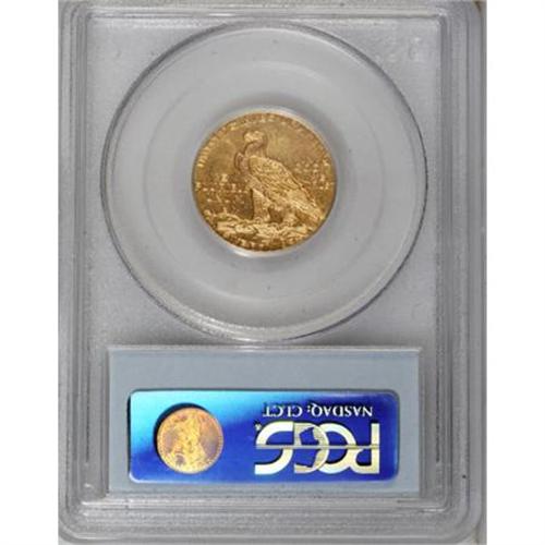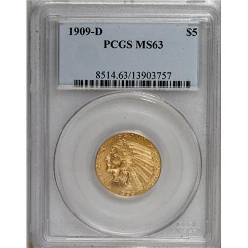 <B>1909-D $5 MS63 PCGS.</B></I> The sun-gold fields of this well struck Select example have a slightly brassy quality. Minimally marked for the grade assigned, though faint, scattered abrasions are present on each side. An excellent type piece nonetheless.<BR><BR><B>Coin Engraver:</B> Bela Lyon Pratt<BR><BR><b>Shipping:</b> Coins & Currency (<a target="_blank" href="http://www.heritageauctions.com/common/shipping.php">view shipping information</a>)