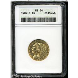 <B>1909-D $5 MS64 ANACS.</B></I> Highly lustrous with bright yellow-gold color and frosty surfaces. A sharply struck example, even the mintmark is fully defined. This is the most common date of the series, and provides and excellent opportunity for the type collector. Lot:8682
