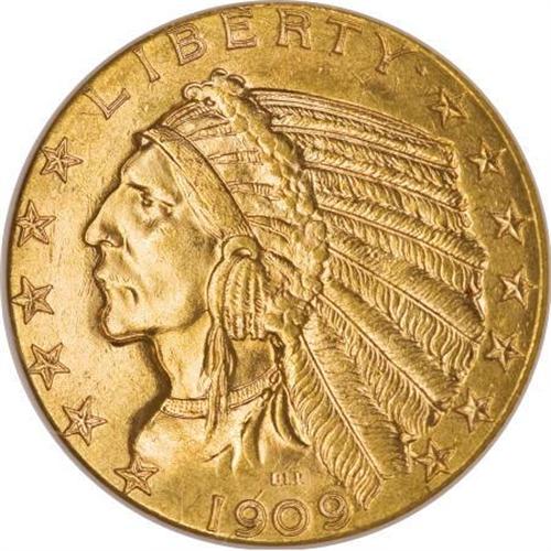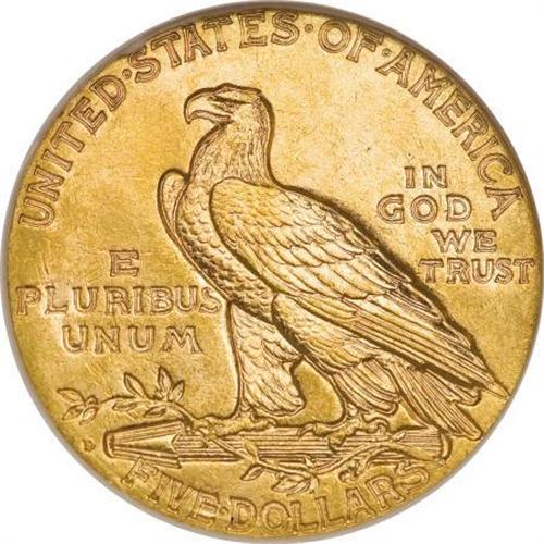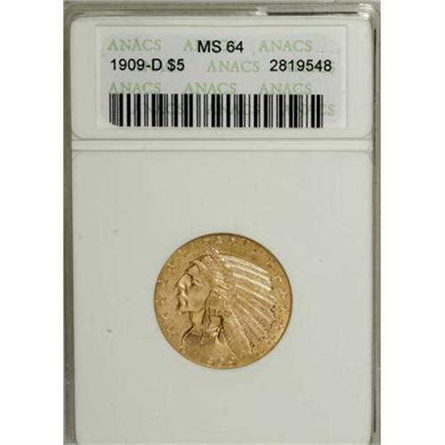 <B>1909-D $5 MS64 ANACS.</B></I> The surfaces are a lovely red-gold, with hints of hazel near the peripheries. This issue is surprisingly scarce in the higher Mint State grades, considering its easy availability in lower grades. This is a robustly struck and essentially problem-free example, with a better-than-average appearance for the grade. <BR><BR><B>Coin Engraver:</B> Bela Lyon Pratt<BR><BR><b>Shipping:</b> Coins & Currency (<a target="_blank" href="http://www.heritageauctions.com/common/shipping.php">view shipping information</a>)