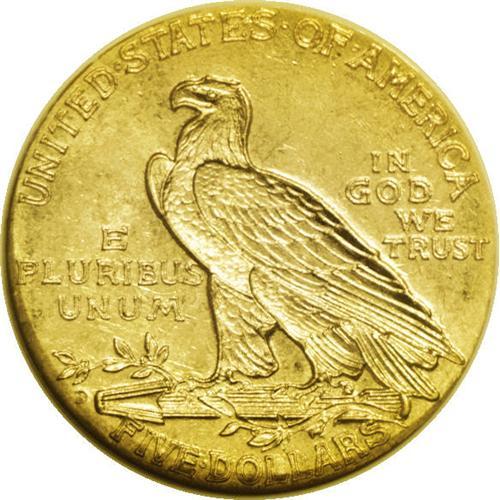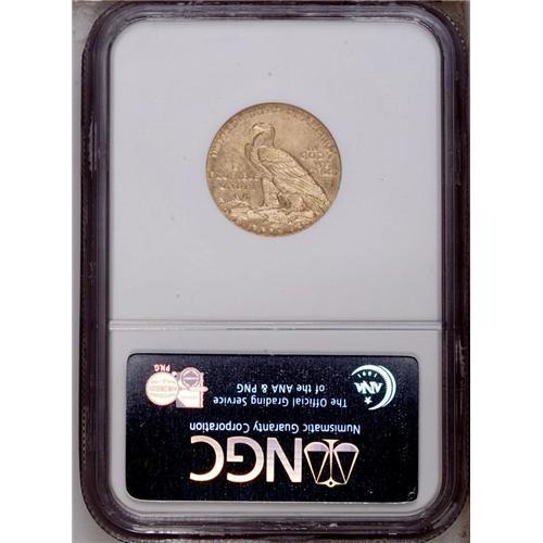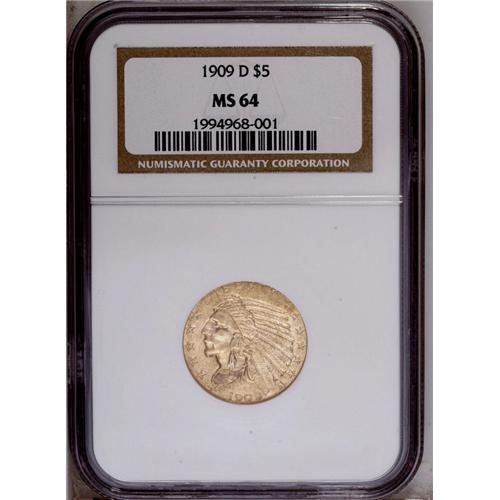 <B>1909-D $5 MS64 NGC.</B></I> Choice and bright, with yellow-gold luster in the fields. One nick near the center of the Motto is present. Although common in this grade, this date is very scarce a point finer.