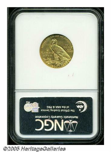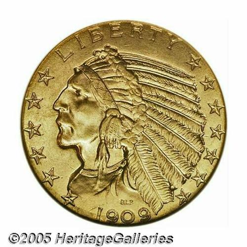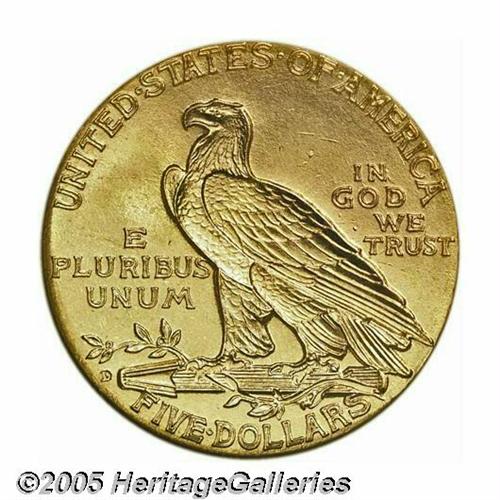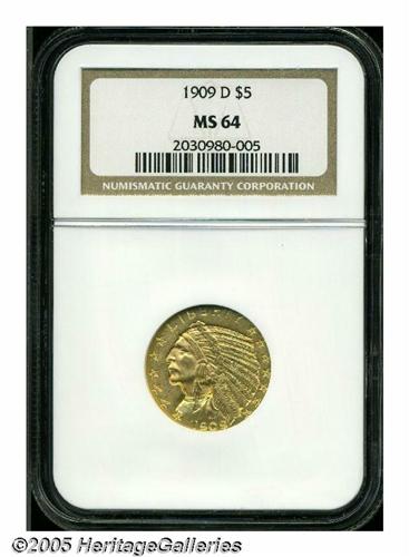 <B>1909-D<$5> MS64 NGC.</B></I> Frosty and brilliant. Most design features are about as sharp as could be desired. A large portion of the surviving examples of this issue are attributed to a hoard that came to light in South America, circa 1955, but it's probably not possible to attribute this piece to that particular source with any certainty.