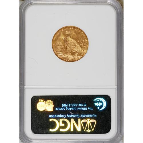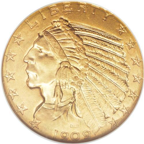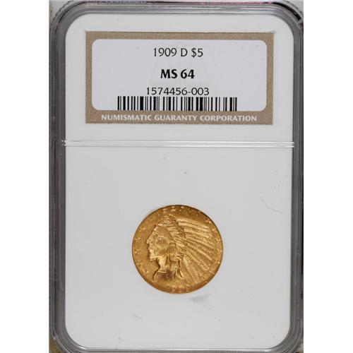 <B>1909-D $5 MS64 NGC.</B></I> The 1909-D Indian half eagle is the most common issue in the series, even in Uncirculated condition. For this reason, it is often the coin chosen for inclusion in type sets. However, a review of the NGC <I>Census Report</B></I> reveals that the 1909-D is comparably scarce to most other non-key-date half eagles in Gem or higher condition. NGC has graded 63 finer, with MS66 being the highest grade achieved at either NGC or PCGS (4/07). This is an especially attractive coin that shows uncommon mint frost, rather than the satiny variant usually seen. Sharply defined and especially colorful with rich reddish color overall.<BR><BR><b>Shipping:</b> Coins & Currency (<a target="_blank" href="http://www.heritageauctions.com/common/shipping.php">view shipping information</a>)