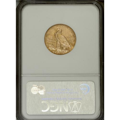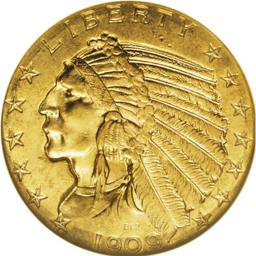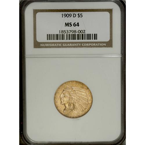 <B>1909-D $5 MS64 NGC.</B></I> The Denver mintmark is bold on this shimmering and sharply impressed near-Gem. The occasional inconspicuous field graze is insufficient to challenge the MS64 designation. A lovely khaki-gold representative of this much-demanded Indian gold type coin.<BR><BR><b>Shipping:</b> Coin/Currency (<a target="_blank" href="http://www.heritageauctions.com/common/shipping.php">view shipping information</a>)