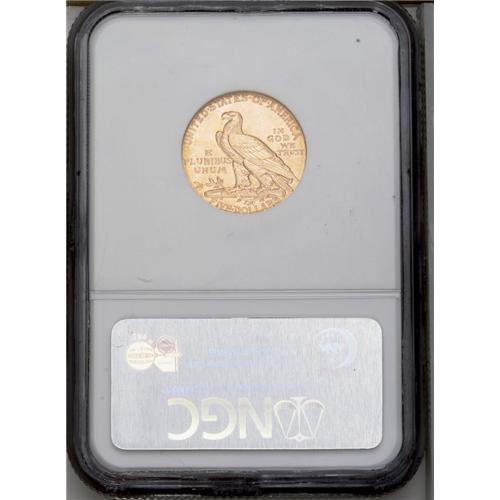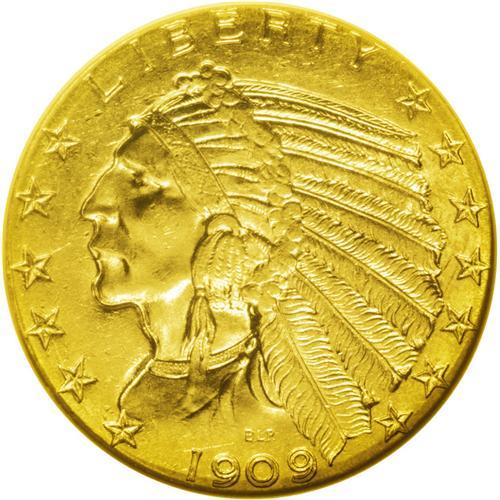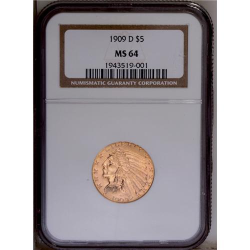 <B>1909-D<$5> MS64 NGC.</B></I> Uncommonly well defined for the type, the frosty surfaces exhibit pleasing copper-gold coloration. The number of wispy abrasions is fewer than normal for this conditionally challenging series.
