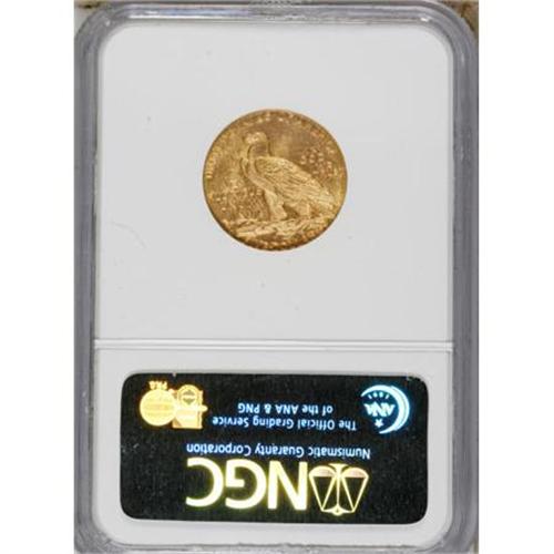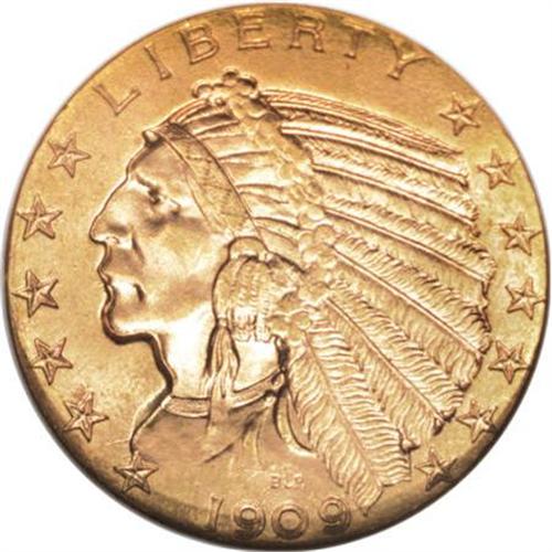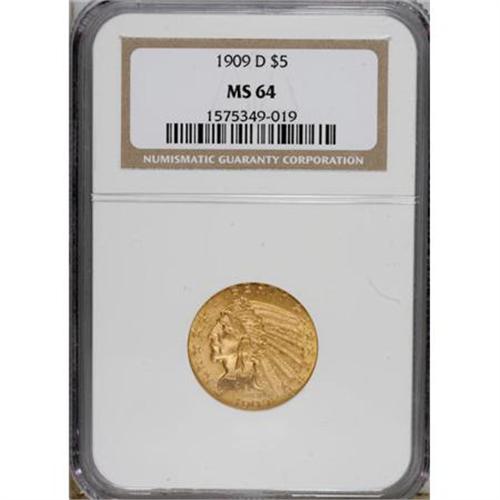 <B>1909-D $5 MS64 NGC.</B></I> A blend of antique-gold and orange color graces the glowing surfaces of this well struck example. Well-preserved overall with only a few wispy marks in the reverse fields and a single small abrasion on the cheek. In 1909, four mints produced half eagles, including the nascent Denver Mint and New Orleans in its final year of production.<BR><BR><b>Shipping:</b> Coins & Currency (<a target="_blank" href="http://www.heritageauctions.com/common/shipping.php">view shipping information</a>)