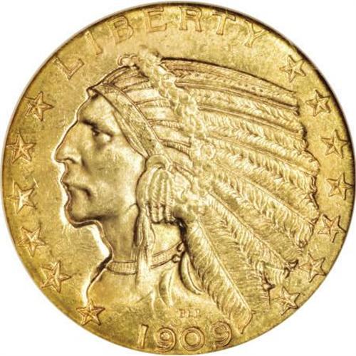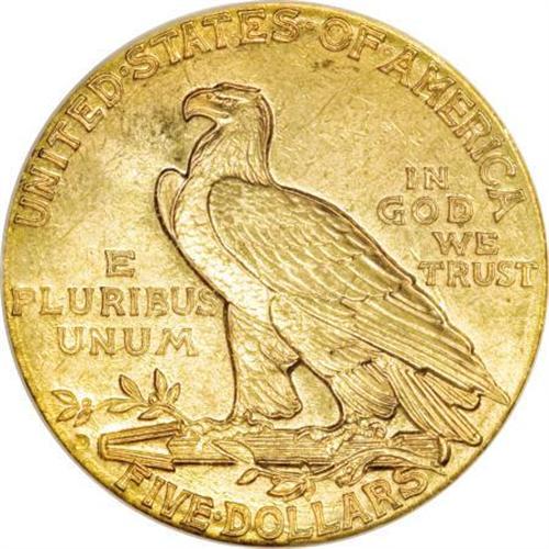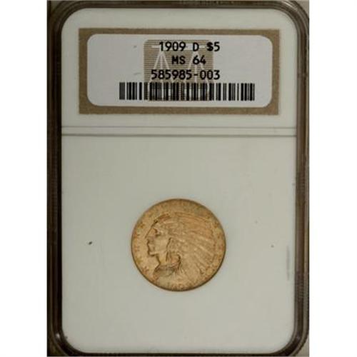 <B>1909-D $5 MS64 NGC.</B></I> Peach and orange iridescence glitters across the lustrous surfaces of this near-Gem. Some scattered abrasions, well within the scope of an MS64 coin, are noted for the sake of accuracy. Although the 1909-D is a common date in this series, finding an example that has charisma, such as the current coin, can be a challenge. <BR><BR><B>Coin Engraver:</B> Bela Lyon Pratt<BR><BR><b>Shipping:</b> Coins & Currency (<a target="_blank" href="http://www.heritageauctions.com/common/shipping.php">view shipping information</a>)