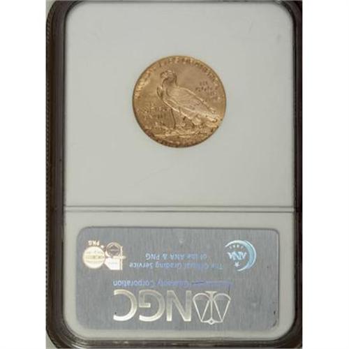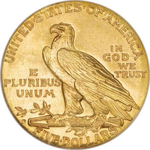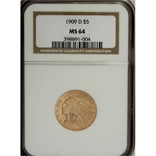 <B>1909-D $5 MS64 NGC.</B></I> This boldly impressed near-Gem gold type coin exhibits dusky olive-gold toning and lacks any consequential marks. The 1909-D has the highest mintage of the series, yet becomes very scarce above the MS64 level, since survivors were saved for their bullion content instead of their numismatic premium.<BR><BR><B>Coin Engraver:</B> Bela Lyon Pratt<BR><BR><b>Shipping:</b> Coins & Currency (<a target="_blank" href="http://www.heritageauctions.com/common/shipping.php">view shipping information</a>)