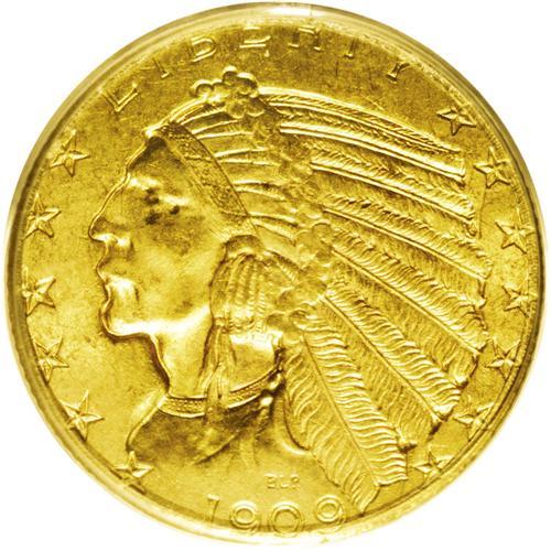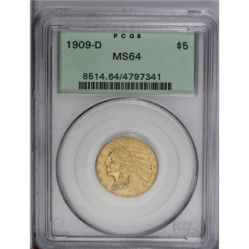 1909-D $5 MS64 PCGS. A boldly struck, minimally abrade