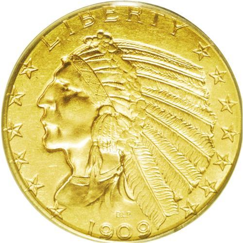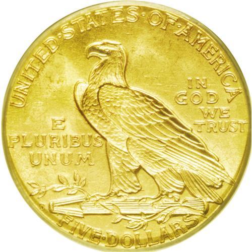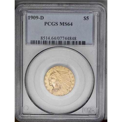 <B>1909-D<$5> MS64 PCGS.</B></I> A delightful and highly appealing pinkish-gold example with frosty obverse and reverse surfaces. Both sides are sharply detailed. Of all the Indian half eagles issued from 1908 to 1929, this date and mintmark combination is the easiest to obtain in Choice or Gem Mint State grades, and yet PCGS has only certified 76 finer examples (6/06).