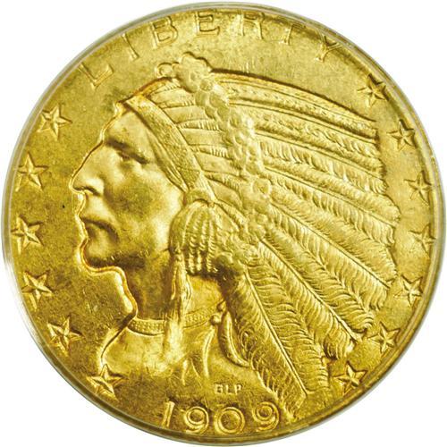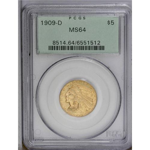 <B>1909-D<$5> MS64 PCGS.</B></I> Although common in lower Mint State grades, the 1909-D is somewhat available in near-Gem condition, as here, and rare in Gem. This highly lustrous example offers orange-gold surfaces with highpoint tinges of hazel, complemented by an absence of mentionable marks. PCGS has graded 76 pieces finer (3/06). <BR><BR><B>Important notice:</B> Heritage usually auctions material at the rate of 200-250 lots per hour. On some occasions eBay Live bid software or the Internet may not be able to keep up with the pace of the auction. We recommend placing a realistic absentee bid now as insurance to avoid disappointment. Occasionally the auctioneer may eliminate or reject an eBay Live bid, and the auctioneer may also reopen a lot after the close of the eBay live bidding (usually because we missed an audience bid), and may reject your bid even if it shows you as the winning bidder. By bidding via eBay Live, you agree that Heritage may award the lot to another bidder at its sole discretion under the circumstances described above or any other reasonable circumstances. Since eBay bids are not shown to us until we open the lot on the floor, we treat those bids just like floor bids. In most cases the floor responds before the eBay bid is presented to us, due to Internet lag time, so for consistency we have made it a policy that floor bids are always considered first over tie eBay live bids. Also please note that all Heritage lots purchased through eBay Live carry a 20% Buyer's Premium. Please make sure you read the Terms and Conditions before you bid. This lot is being auctioned in conjunction with a live floor auction by Heritage Galleries & Auctioneers. All final auction and invoice information will be supplied by Heritage Galleries & Auctioneers, and all other information should be considered preliminary. Lot:2881 <BR><BR><B>Winning Notification and Billing:</B> After the FINAL session in this auction is complete, Heritage will send e-mail and snail mail invoices. This process normally takes several days. All final auction and invoice information will be supplied by Heritage Galleries & Auctioneers, and all other information should be considered preliminary. <BR><BR>This auction will be conducted on a live auction floor and over the Internet through eBay Live. If you choose to place an absentee bid, please take a moment to <font color='#0000ff'><u><a href='http://pages.ebay.com/liveauctions/help/before/laabsentee.html'>learn how eBay Live absentee bidding works</a></u></font><font color='#000000'>