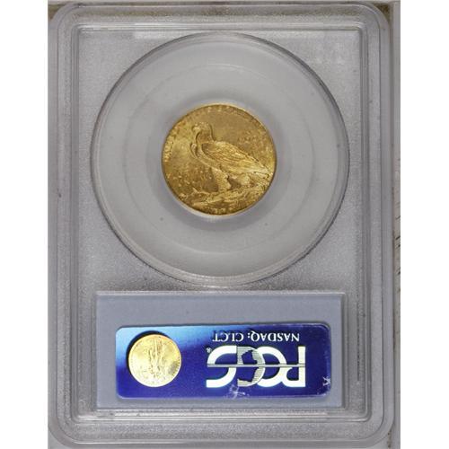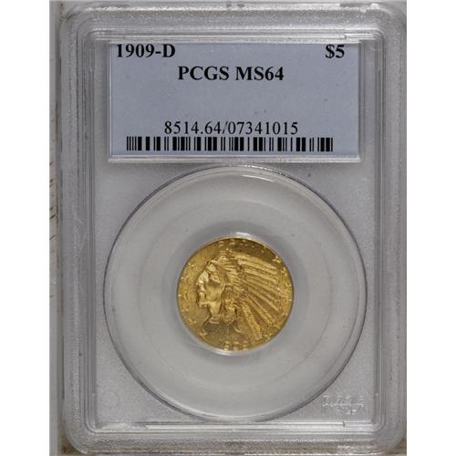 <B>1909-D<$5> MS64 PCGS.</B></I> An exquisitely struck type representative with full headdress detail. The arrows bundle and claws are also intricate, and the mintmark is sharp. The satin luster is unbroken, and its sheen fails to reveal any noticeable marks. The khaki-gold toning only adds to the eye appeal.