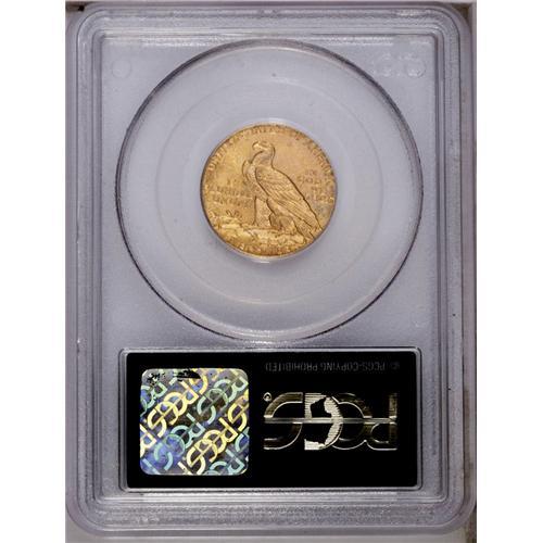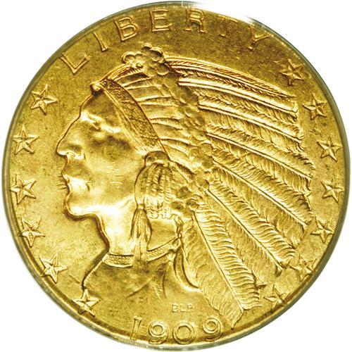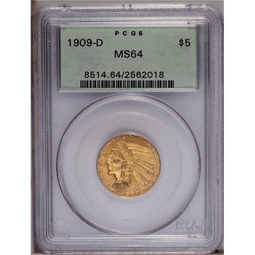 <B>1909-D<$5> MS64 PCGS.</B></I> As nice as this date is usually found, with a full Gem grade not only rare, but prohibitive for most collectors to consider. Frosty luster throughout and a bold strike. Minimal surface marks for the grade, and great eye appeal for the collector who needs an example of this date. Housed in an older green insert PCGS holder. <BR><BR><B>Important notice:</B> Heritage usually auctions material at the rate of 200-250 lots per hour. On some occasions eBay Live bid software or the Internet may not be able to keep up with the pace of the auction. We recommend placing a realistic absentee bid now as insurance to avoid disappointment. Occasionally the auctioneer may eliminate or reject an eBay Live bid, and the auctioneer may also reopen a lot after the close of the eBay live bidding (usually because we missed an audience bid), and may reject your bid even if it shows you as the winning bidder. By bidding via eBay Live, you agree that Heritage may award the lot to another bidder at its sole discretion under the circumstances described above or any other reasonable circumstances. Since eBay bids are not shown to us until we open the lot on the floor, we treat those bids just like floor bids. In most cases the floor responds before the eBay bid is presented to us, due to Internet lag time, so for consistency we have made it a policy that floor bids are always considered first over tie eBay live bids. Also please note that all Heritage lots purchased through eBay Live carry a 20% Buyer's Premium. Please make sure you read the Terms and Conditions before you bid. This lot is being auctioned in conjunction with a live floor auction by Heritage Galleries & Auctioneers. All final auction and invoice information will be supplied by Heritage Galleries & Auctioneers, and all other information should be considered preliminary. Lot:2879 <BR><BR><B>Winning Notification and Billing:</B> After the FINAL session in this auction is complete, Heritage will send e-mail and snail mail invoices. This process normally takes several days. All final auction and invoice information will be supplied by Heritage Galleries & Auctioneers, and all other information should be considered preliminary. <BR><BR>This auction will be conducted on a live auction floor and over the Internet through eBay Live. If you choose to place an absentee bid, please take a moment to <font color='#0000ff'><u><a href='http://pages.ebay.com/liveauctions/help/before/laabsentee.html'>learn how eBay Live absentee bidding works</a></u></font><font color='#000000'>