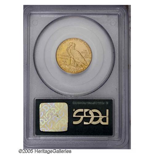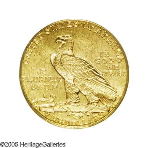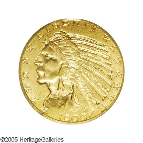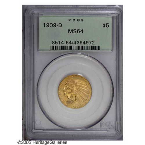 <B>1909-D<$5> MS64 PCGS.</B></I> Booming luster and an absence of appreciable marks promote this coin over most other survivors of this, the most common five dollar Indian type coin. Coppery-orange surfaces yield to hints of hazel at the highpoints. Crisply struck and a desirable type coin. In a PCGS green-label holder.