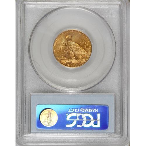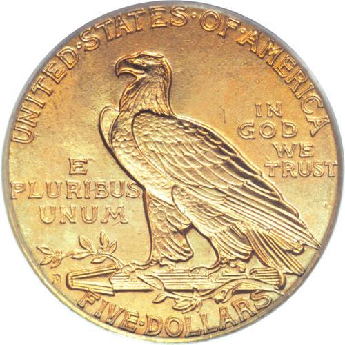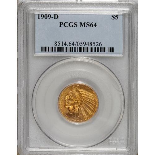 <B>1909-D $5 MS64 PCGS.</B></I> Rich apricot-gold and lime-green patination compete for territory on this MS64 five dollar piece. Intense luster adds to the eye appeal, as do the sharply struck design features. A few minute handling marks deny full Gem status for this marvelous coin, which is expected to generate spirited bidding.<BR><BR><b>Shipping:</b> Coins & Currency (<a target="_blank" href="http://www.heritageauctions.com/common/shipping.php">view shipping information</a>)
