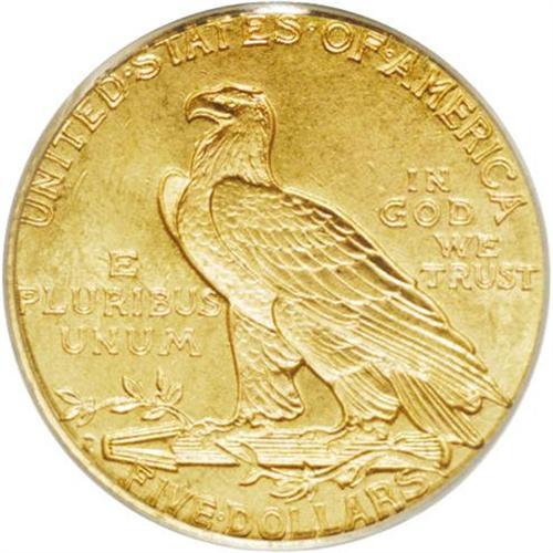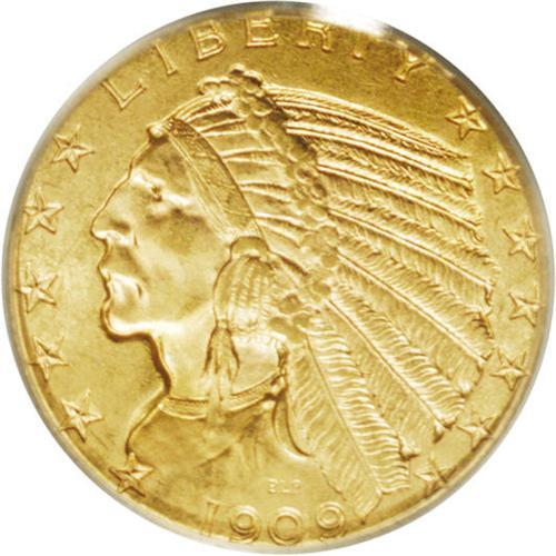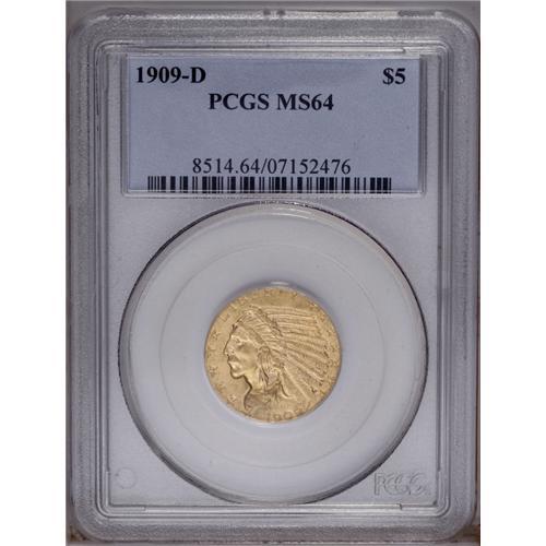 <B>1909-D<$5> MS64 PCGS.</B></I> The '09-D is by far the most available five dollar Indian issue in Mint State, but the vast majority of survivors fall into the MS60 to MS63 grade range. This sharply defined example is very well struck and shows only minimal surface marks.