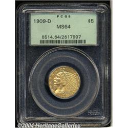 <B>1909-D<$5> MS64 PCGS.</B></I> A coin for the high grade 20th century gold type collector, this near-Gem Five is richly and originally colored in reddish-gold shades. Suitably bold in strike, the surfaces are lustrous and possessed of only a few scattered abrasions. Conditionally scarce, as are all Indian Half Eagles certified at or above the MS64 level.<BR><I>From The Greenwich Collection, Part One.</B></I> <BR><BR><B>Important notice:</B> Heritage usually auctions material at the rate of 200-250 lots per hour. On some occasions eBay Live bid software or the Internet may not be able to keep up with the pace of the auction. We recommend placing a realistic absentee bid now as insurance to avoid disappointment. Occasionally the auctioneer may eliminate or reject an eBay Live bid, and the auctioneer may also reopen a lot after the close of the eBay live bidding (usually because we missed an audience bid), and may reject your bid even if it shows you as the winning bidder. By bidding via eBay Live, you agree that Heritage may award the lot to another bidder at its sole discretion under the circumstances described above or any other reasonable circumstances. Since eBay bids are not shown to us until we open the lot on the floor, we treat those bids just like floor bids. In most cases the floor responds before the eBay bid is presented to us, due to Internet lag time, so for consistency we have made it a policy that floor bids are always considered first over tie eBay live bids. Also please note that all Heritage lots purchased through eBay Live carry a 20% Buyer's Premium. Please make sure you read the Terms and Conditions before you bid.