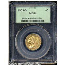 <B>1909-D<$5> MS64 PCGS.</B></I> Boldly struck with bright orange-golden color and an unusually good strike for the date. Just a few small marks on the reverse limit the grade.<BR><I>From The Greenwich Collection, Part One.</B></I> <BR><BR><B>Important notice:</B> Heritage usually auctions material at the rate of 200-250 lots per hour. On some occasions eBay Live bid software or the Internet may not be able to keep up with the pace of the auction. We recommend placing a realistic absentee bid now as insurance to avoid disappointment. Occasionally the auctioneer may eliminate or reject an eBay Live bid, and the auctioneer may also reopen a lot after the close of the eBay live bidding (usually because we missed an audience bid), and may reject your bid even if it shows you as the winning bidder. By bidding via eBay Live, you agree that Heritage may award the lot to another bidder at its sole discretion under the circumstances described above or any other reasonable circumstances. Since eBay bids are not shown to us until we open the lot on the floor, we treat those bids just like floor bids. In most cases the floor responds before the eBay bid is presented to us, due to Internet lag time, so for consistency we have made it a policy that floor bids are always considered first over tie eBay live bids. Also please note that all Heritage lots purchased through eBay Live carry a 20% Buyer's Premium. Please make sure you read the Terms and Conditions before you bid.