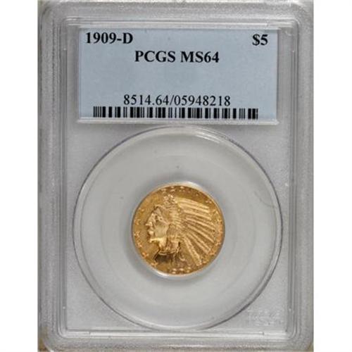 <B>1909-D $5 MS64 PCGS.</B></I> The 1909-D, with its 3,423,560-piece mintage, is among the most available dates of the Indian Head five dollar series. The current near-Gem displays brass-gold color and highly lustrous surfaces. Sharply struck with a few grade-defining marks on the reverse.<BR><BR><b>Shipping:</b> Coins & Currency (<a target="_blank" href="http://www.heritageauctions.com/common/shipping.php">view shipping information</a>)