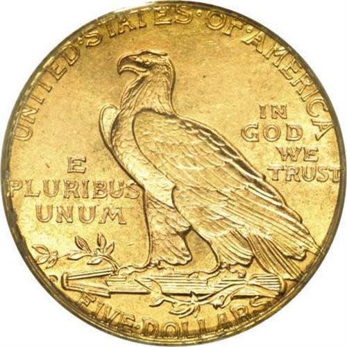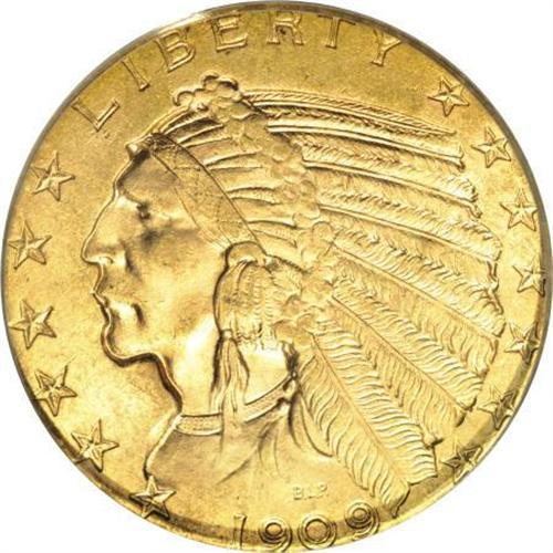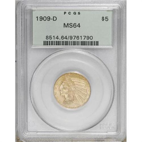 <B>1909-D $5 MS64 PCGS.</B></I> Luxurious rose-gold coloration is seen on both sides of this well-preserved near-Gem. The surfaces are lustrous and clean, with the only mark worthy of mention being a shallow diagonal scrape cross the eagle's breast on the reverse. This issue has a reputation for being of high quality, but Gem examples are elusive.<BR><BR><B>Coin Engraver:</B> Bela Lyon Pratt<BR><BR><b>Shipping:</b> Coins & Currency (<a target="_blank" href="http://www.heritageauctions.com/common/shipping.php">view shipping information</a>)