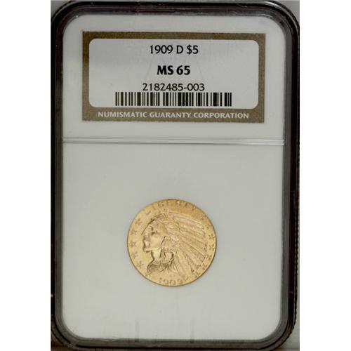 <B>1909-D $5 MS65 NGC.</B></I> This is an amazing Gem Mint State example, an exceptional candidate for the date or type collector. The Indian half eagles are all rare in Gem grades, despite the individual status of any given date. For instance, the 1909-D half eagle is considered one of the most common dates in the entire series issued from 1908 through 1929, and yet the population reflects a coin that is hardly considered common. This piece is sharply struck and exhibits excellent pinkish yellow-gold luster. While a few tiny marks keep it from an even higher grade, it is a wonderful representative of the unusual Indian Head design. Census: 57 in 65, 2 finer (10/06).<BR><BR><b>Shipping:</b> Coin/Currency (<a target="_blank" href="http://www.heritageauctions.com/common/shipping.php">view shipping information</a>)