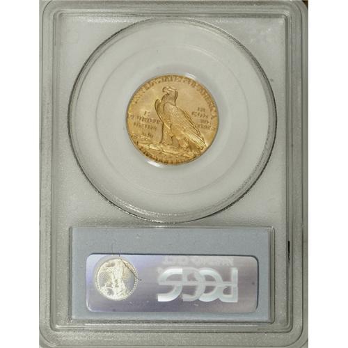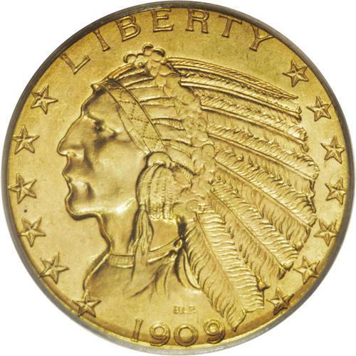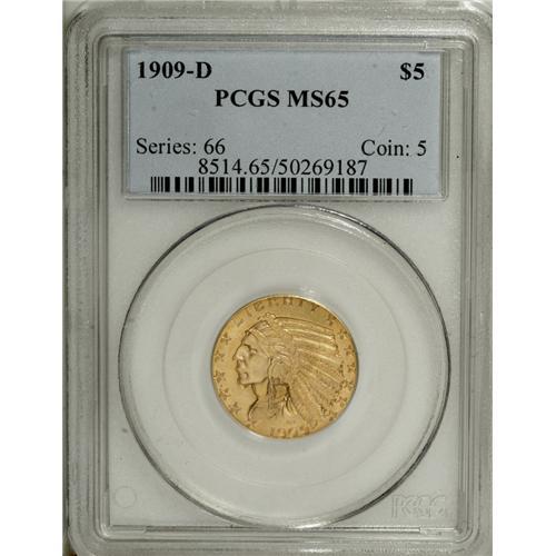 <B>1909-D $5 MS65 PCGS.</B></I> Although this date is clearly the most common of the Indian half eagle series, it is a condition rarity in Gem quality, as are all dates of this type. The mintage of nearly 3.5 million coins is well more than double the next closest issue, the 1911-S with 1.4 million coins minted. These two dates are the sole entries in the list of 1 million plus mintages for the entire series. This piece is sharply struck with rich honey-gold luster and frosty obverse and reverse surfaces. It is an exceptional example for the date and type, a coin for the connoisseur who appreciates the finest. Population: 74 in 65, 5 finer (12/06).<BR><BR><b>Shipping:</b> Coin/Currency (<a target="_blank" href="http://www.heritageauctions.com/common/shipping.php">view shipping information</a>)