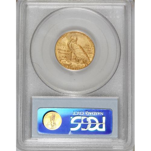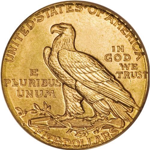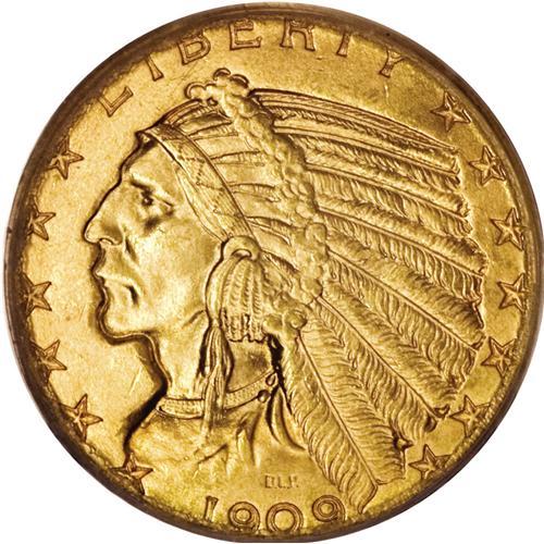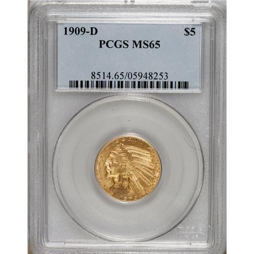 <B>1909-D $5 MS65 PCGS.</B></I> Bela Lyon Pratt's Indian half eagle was struck from 1908 to 1916, and again, for one year in 1929. One of only two American coins struck in reduced relief (the other being Pratt's quarter eagle), it is common up through MS64, with the 1909-D the most common. Nearly 3.5 million pieces were struck at the Denver Mint in 1909. One might assume that a coin available in such large quantities would have its fair share of Gem examples. However, critics of the reduced relief design believed the coins would wear more quickly and be more susceptible to marks than those coins with raised relief. Perhaps they were right, as the vast majority of Mint State pieces fall within the lower end due to nicks and dings. This is a particularly well struck example that shows rich orange-gold color with none of the often-seen green patina in the fields. In Gem and higher, the Indian half eagle becomes significantly more difficult. The PCGS <I>Population Report</B></I> shows nearly 17,500 specimens of the 1909-D graded from MS60 through MS63. They have graded 2,029 pieces MS64, but only 80 in MS65 and five in MS66, with none higher (3/07).<BR><BR><b>Shipping:</b> Coins & Currency (<a target="_blank" href="http://www.heritageauctions.com/common/shipping.php">view shipping information</a>)