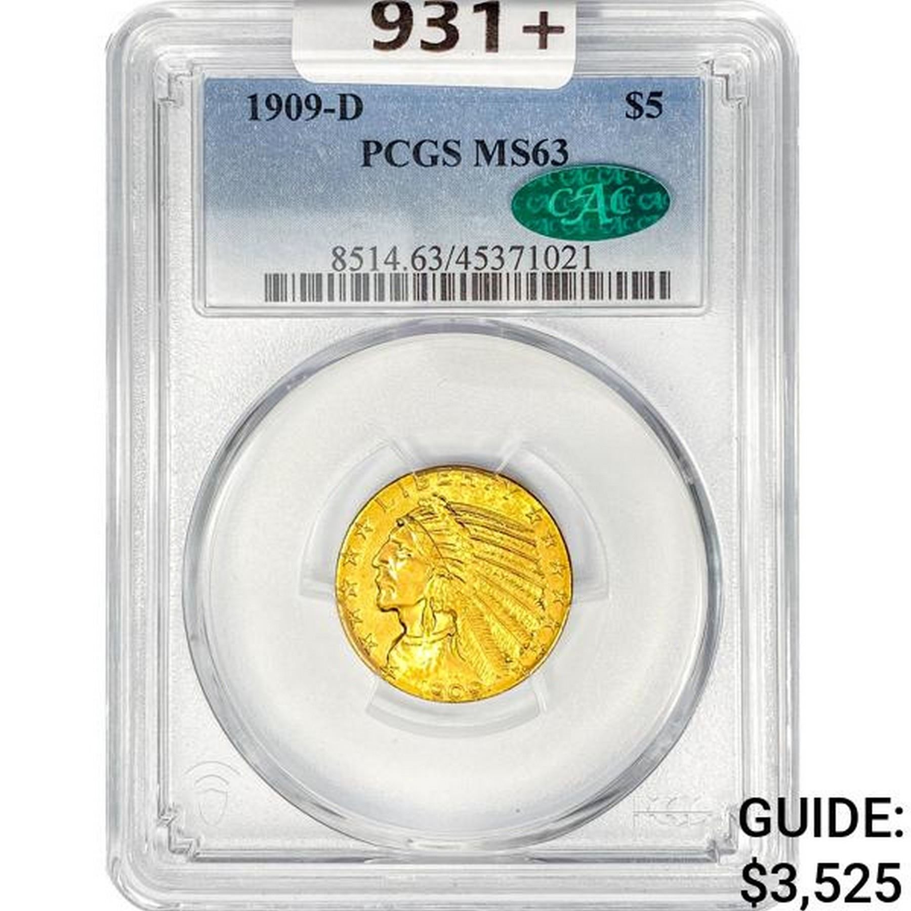 1909-D CAC $5 Gold Half Eagle PCGS MS63