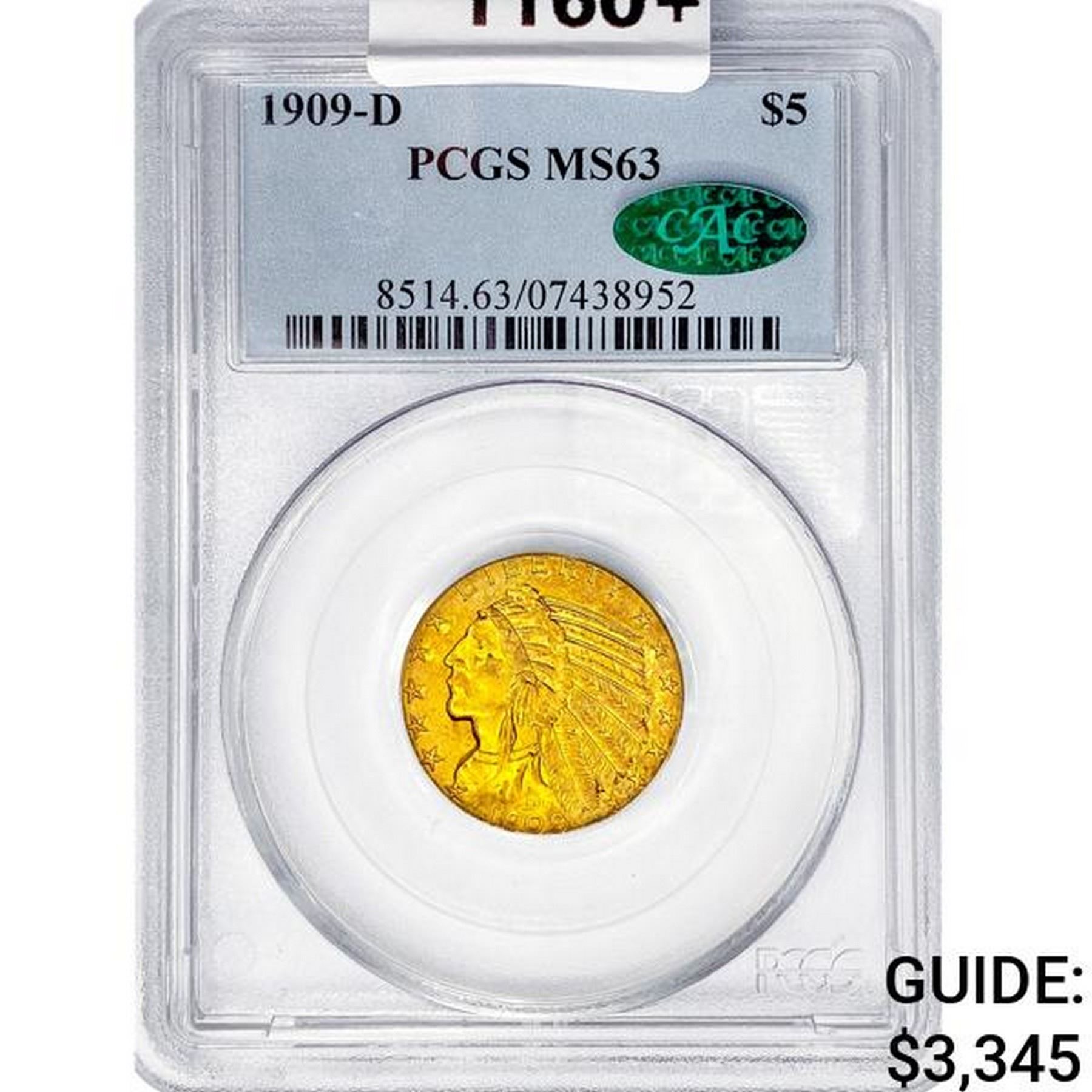 1909-D CAC $5 Gold Half Eagle PCGS MS63