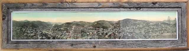 in antique barn wood frame, colored showing birds eye view of Main Street and surrounding area.