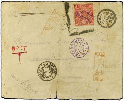 1909 Envelope bearing Japanese fiscal stamp used for postage, sent from small village but not accepted on arrival in NAGASAKI and taxed "50 cent." various boxed Japanese instructional markings and manuscript registered crossed out. MOJI transit via Siberia to Belgium. A scarce item of Japanese postal history.