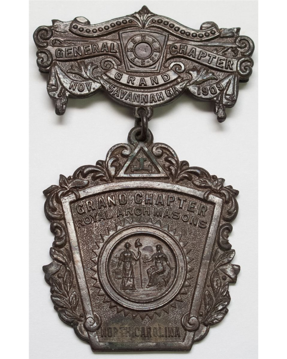 Savannah, November 1909, General Chapter. Attached is a Grand Chapter Royal Arch Masons of North Carolina. Dark metal but very ornate.