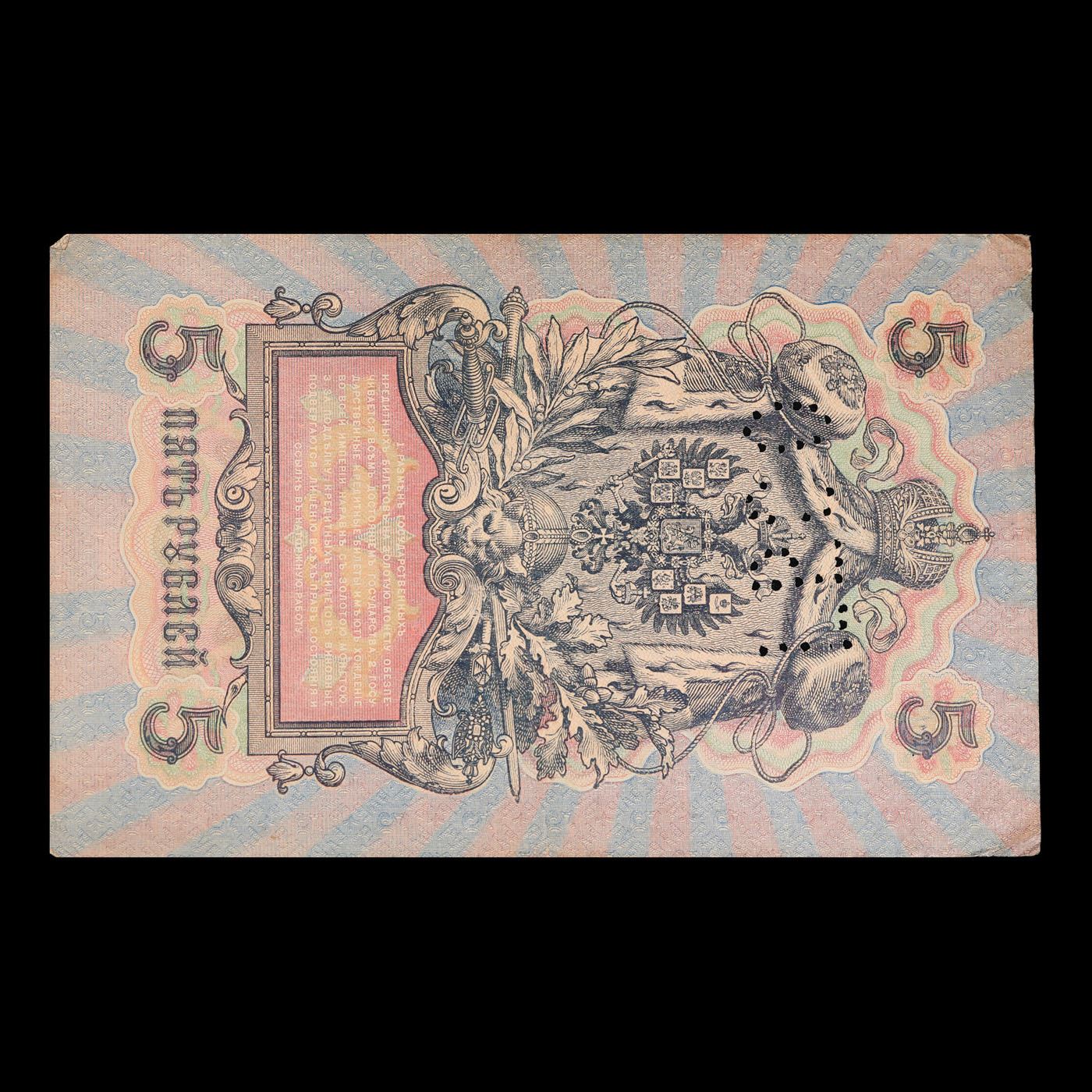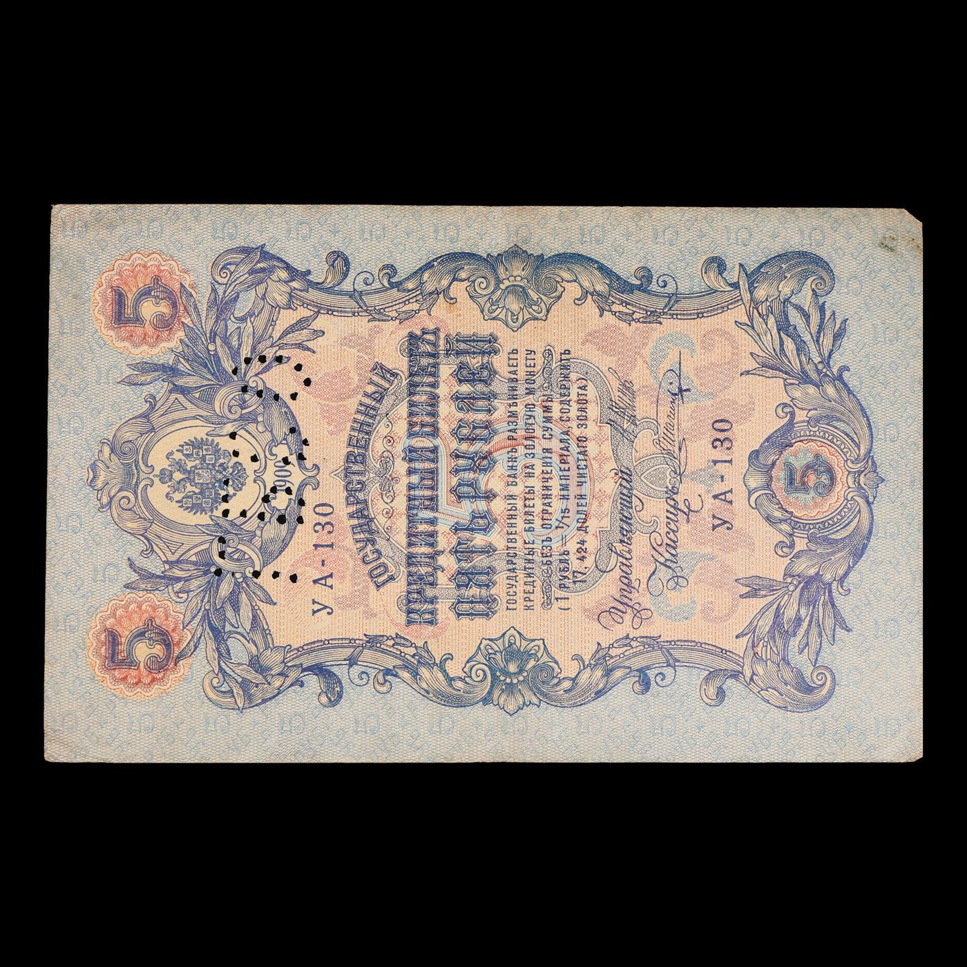 1909 Imerpial Russia 5 Rubles Note P# 10B Grades Choice AU. Up for auction we have a beautiful, ornate Imperial Ruble note from the final decade of the Russian Empire under Tsar Nicholas II, which managed to survive through the Russian Revolution and Civil War. These notes became relatively useless in the early Soviet period, due to hyperinflation and other factors, and many were lost or destroyed.