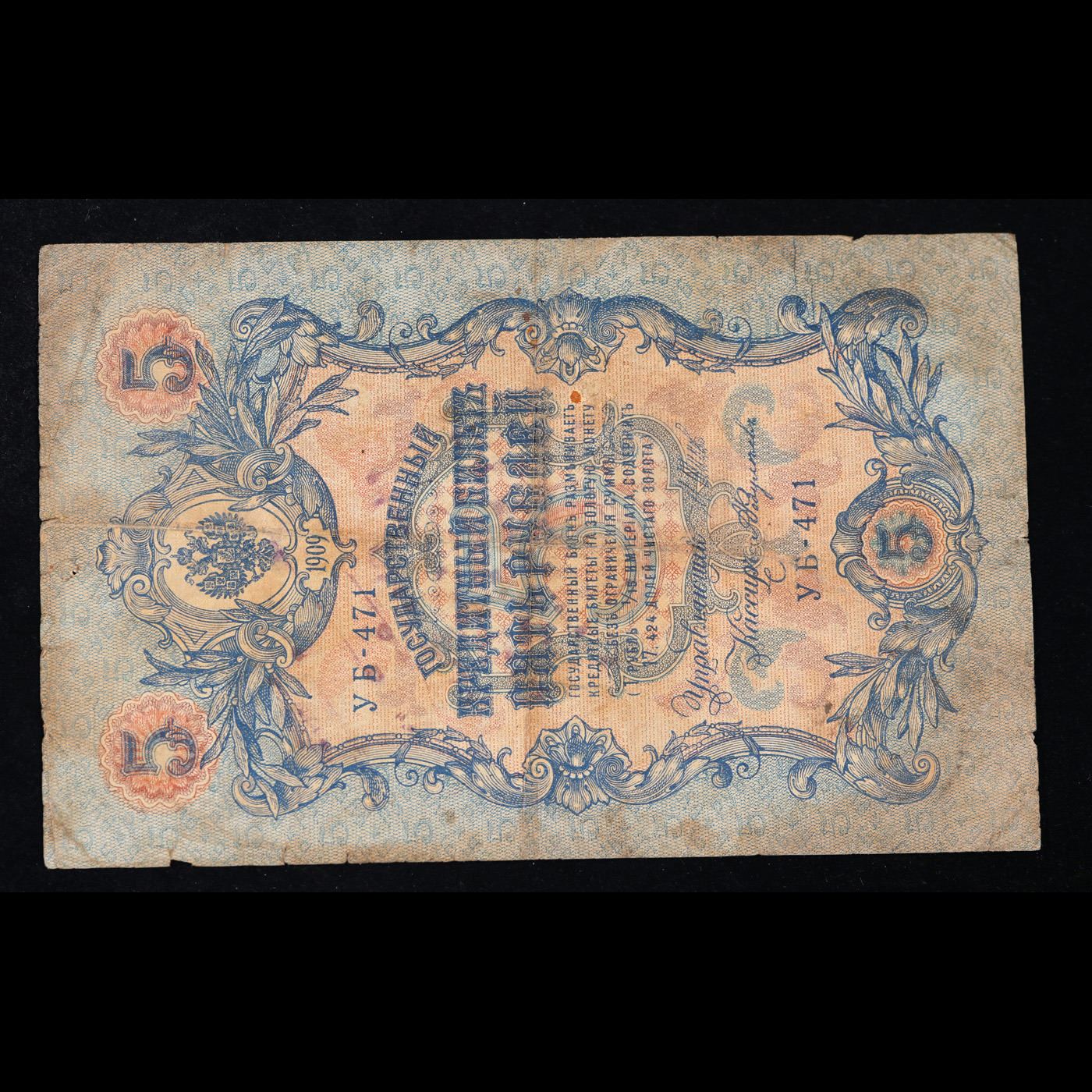 1909 Imerpial Russia 5 Rubles Note P# 10B Grades vf++. Up for auction we have a beautiful, ornate Imperial Ruble note from the final decade of the Russian Empire under Tsar Nicholas II, which managed to survive through the Russian Revolution and Civil War. These notes became relatively useless in the early Soviet period, due to hyperinflation and other factors, and many were lost or destroyed.