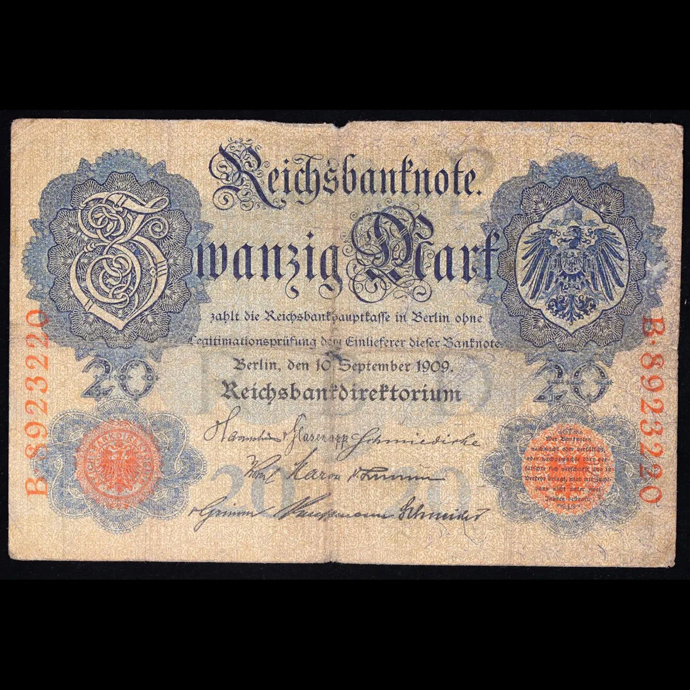 1909 Imperial Gremany 20 Mark Note P# 37 Grades vf+. From 1871 to 1914 the German Mark was known as the "Goldmark", as it was on the gold standard. During WWI, like most nations, Germany removed the gold backing and ceased circulation of gold coins. The Goldmark was the culmination of years of effort put into unifying the currency of Germany.