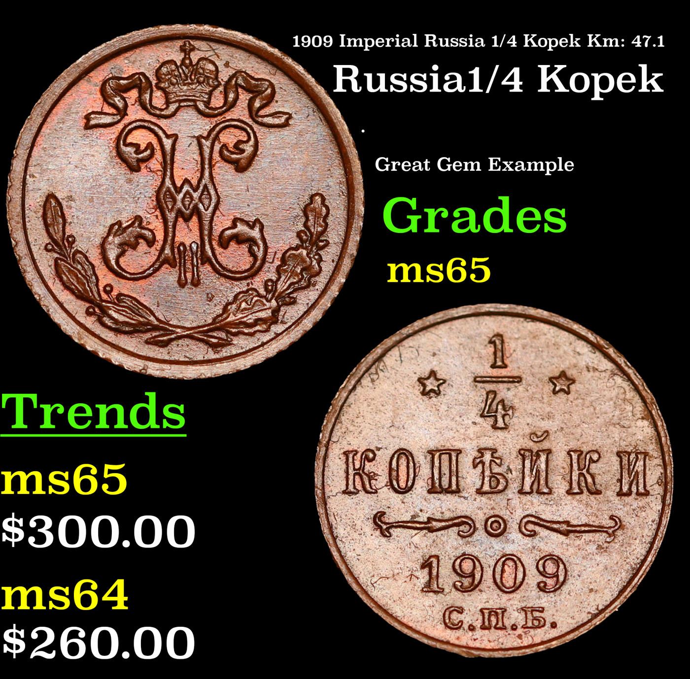 1909 Imperial Russia 1/4 Kopek Km: 47.1 Grades GEM Unc.