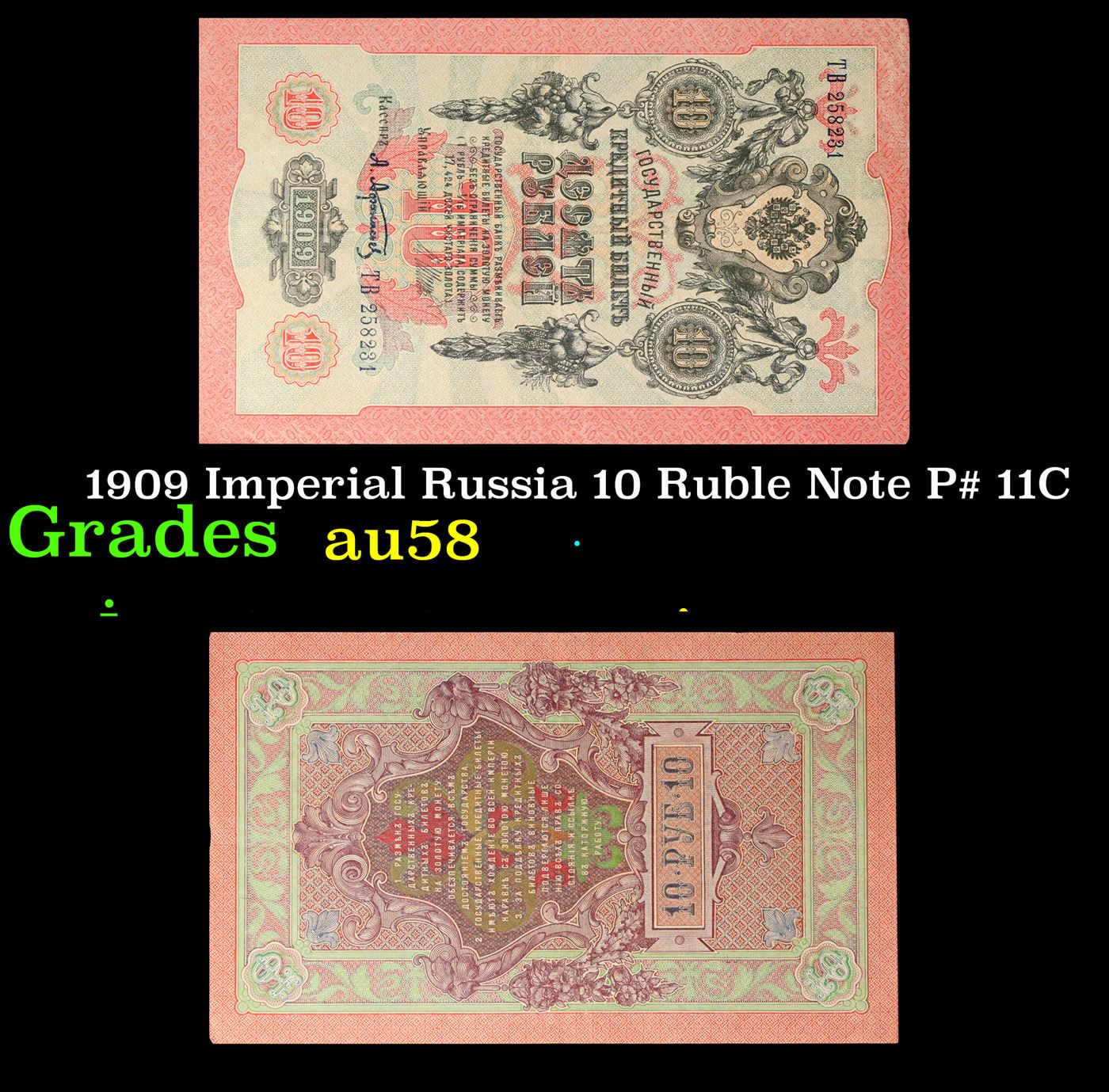 1909 Imperial Russia 10 Ruble Note P# 11C Grades Choice AU/BU Slider. Up for auction we have a beautiful, ornate Imperial Ruble note from the final decade of the Russian Empire under Tsar Nicholas II, which managed to survive through the Russian Revolution and Civil War. These notes became relatively useless in the early Soviet period, due to hyperinflation and other factors, and many were lost or destroyed.