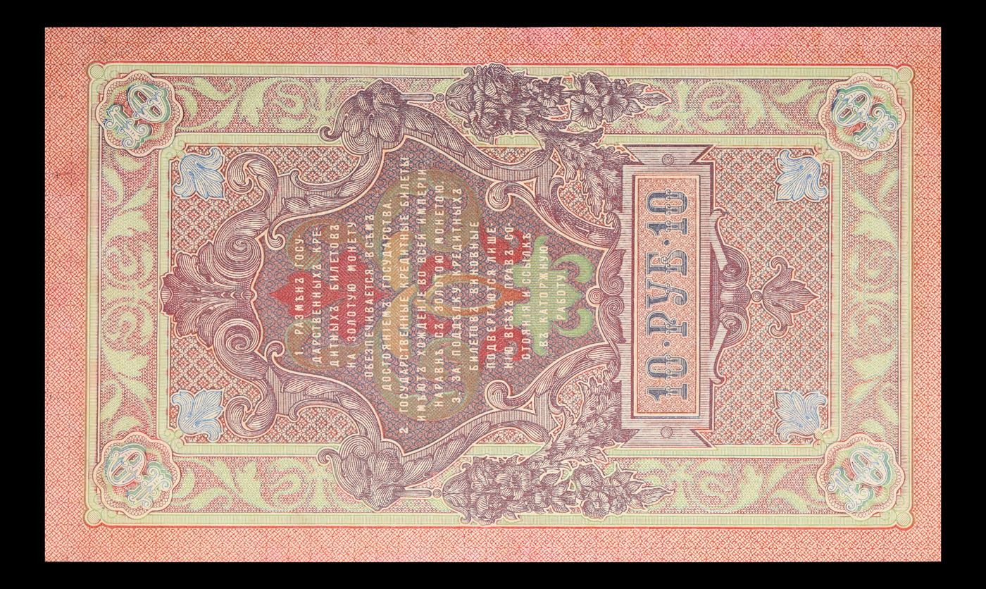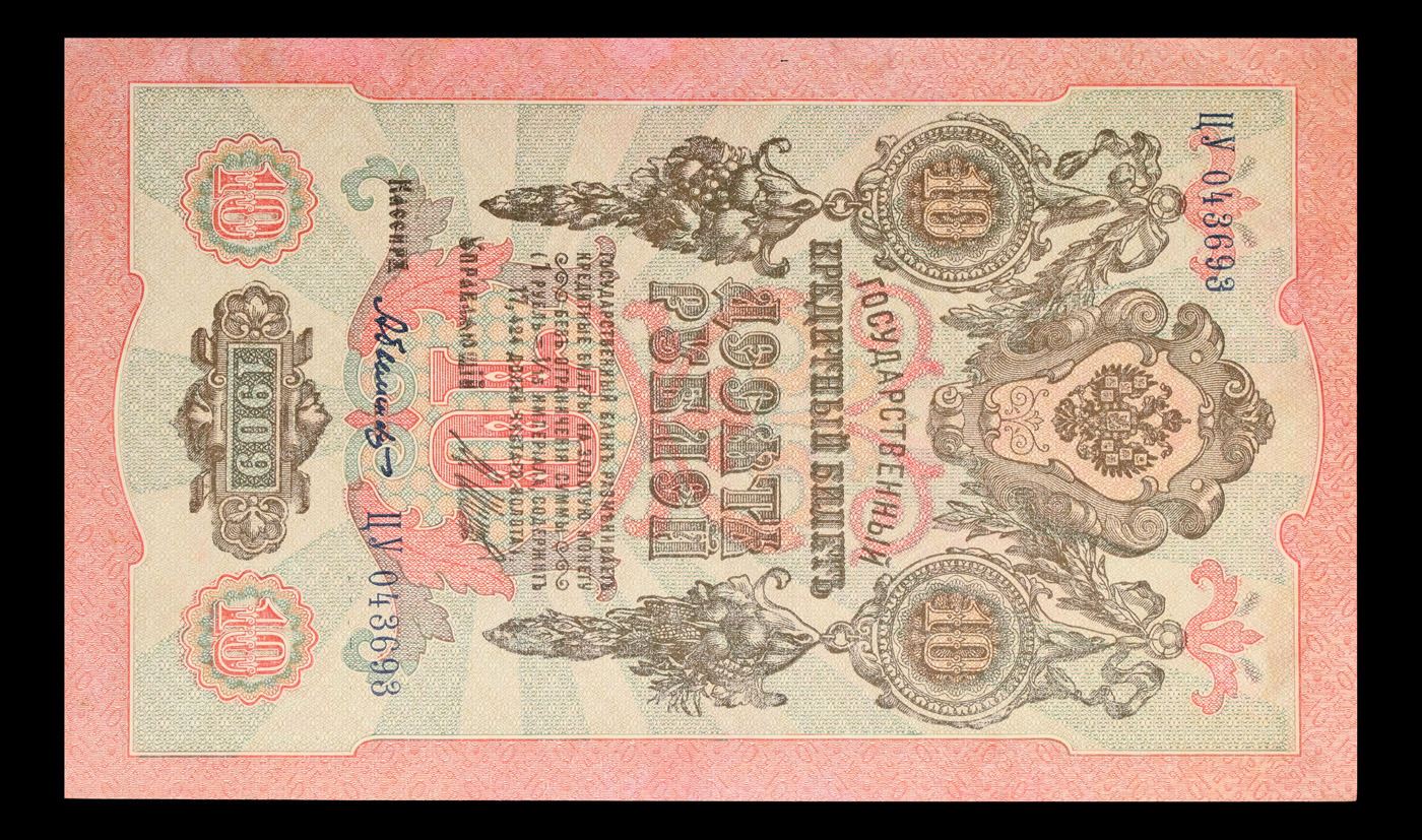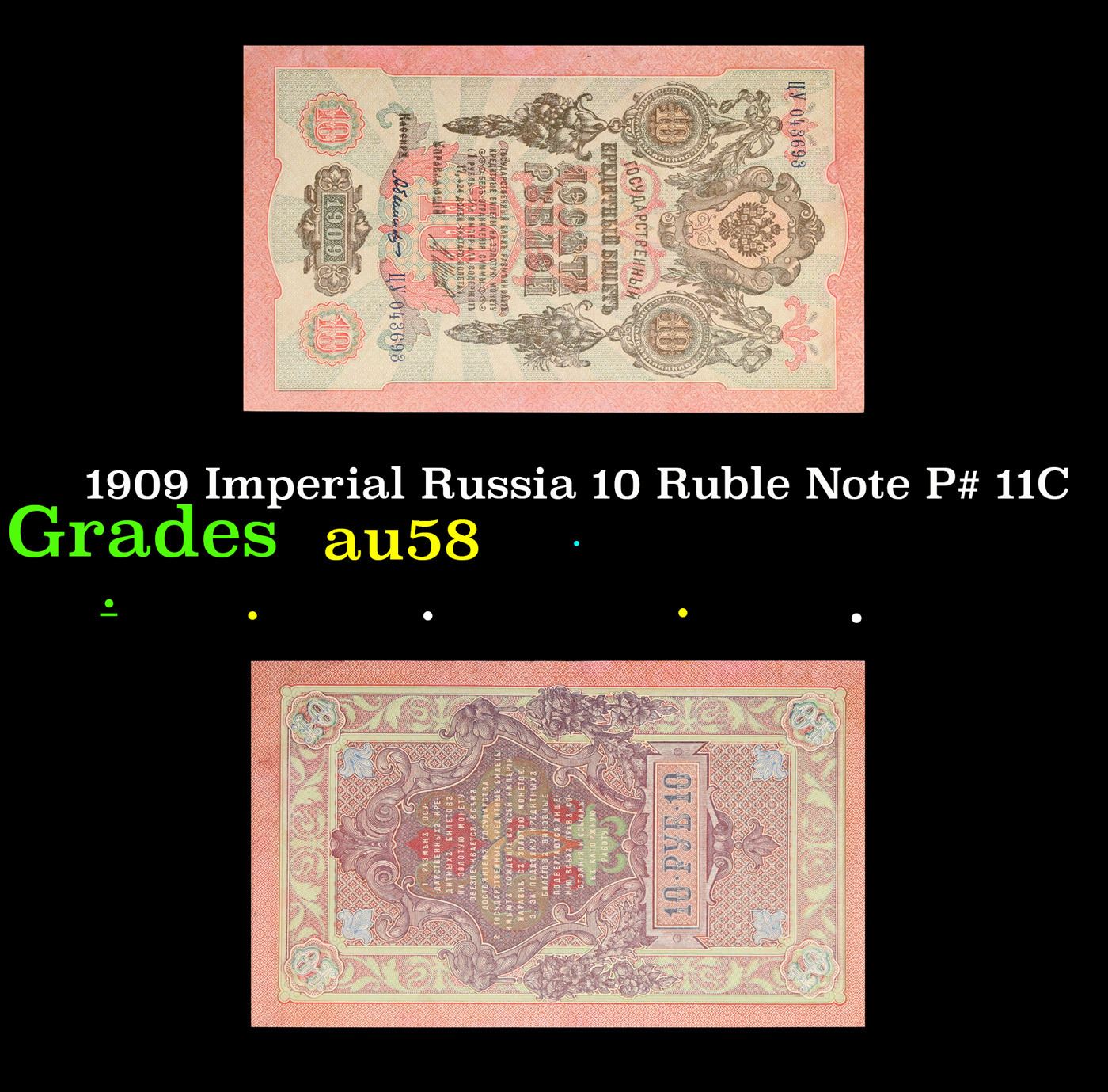 1909 Imperial Russia 10 Ruble Note P# 11C Grades Choice AU/BU Slider. Up for auction we have a beautiful, ornate Imperial Ruble note from the final decade of the Russian Empire under Tsar Nicholas II, which managed to survive through the Russian Revolution and Civil War. These notes became relatively useless in the early Soviet period, due to hyperinflation and other factors, and many were lost or destroyed.